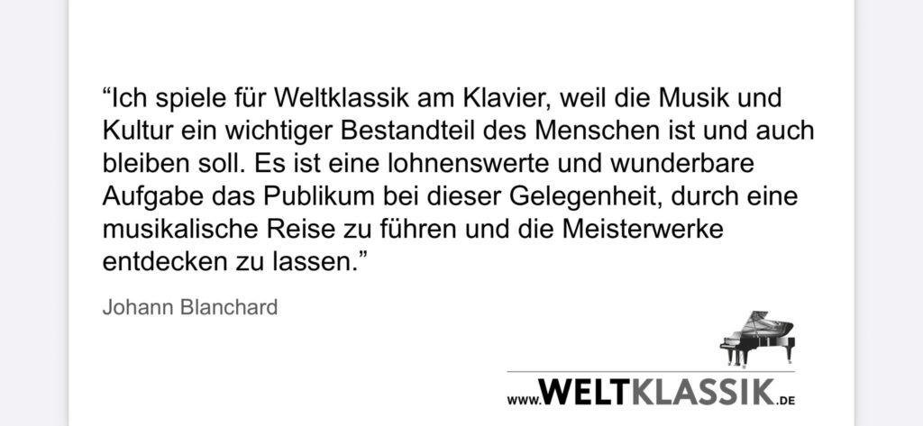 „Ich spiele für Weltklassik am Klavier, weil die Musik und Kultur ein wichtiger Bestandteil des Menschen ist und auch bleiben soll. Es ist eine lohnenswerte und wunderbare Aufgabe das Publikum bei dieser Gelegenheit, durch eine musikalische Reise zu führen und die Meisterwerke entdecken zu lassen.“ – Johann Blanchard Johann Blanchard wurde 1988 in Frankreich geboren und lebt seit 1992 in Deutschland. Er wuchs in einer musikalischen Familie auf, in der er natürlich die klassische Musik schätzen lernte. Im Alter von sechs Jahren erhielt er seinen ersten Klavierunterricht, den er später am Musikgymnasium Weimar fortführte. In dieser Zeit spielte er seine ersten Konzerte als Solist sowie mit Orchester. 2006 führte ihn der Weg nach Rostock, wo er sein Studium mit Auszeichnung abschloss. Parallel studierte er an der Universität in Wien. Während seiner Studienzeit war er Stipendiat der Studienstiftung des deutschen Volkes und erhielt zahlreiche Preise und Auszeichnungen in internationalen Wettbewerben. Johann Blanchard möchte die Begeisterung für das eigene Musizieren gern teilen, daher unterrichtet er gern, u. a. am C. Ph. E. Bach Musikgymnasium Berlin.