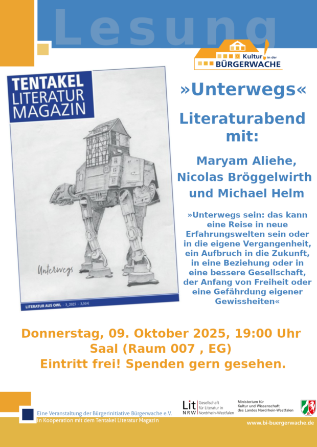 Unter dem Titel »Unterwegs« laden das Literaturmagazin Tentakel und das Stadtteilzentrum Bürgerwache am Donnerstag, den 9. Oktober 2025 zu einer literarischen Lesung ein. Beginn ist um 19:00 Uhr im Saal (Raum 007, EG) der Bürgerwache am Siegfriedplatz.