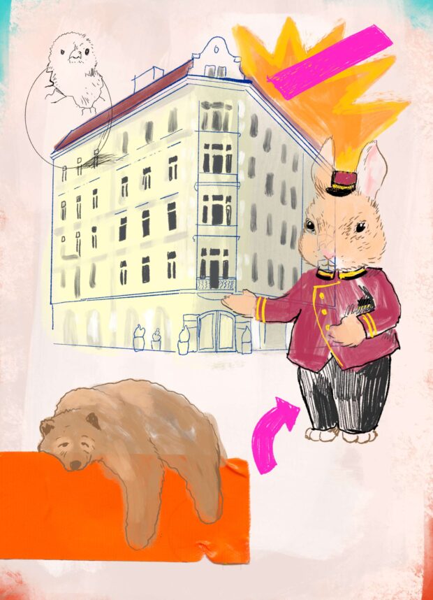 Im Grand Hotel der Tiere ist ordentlich was los: Kaum hat Kaninchen Bellhop seinen ersten Arbeitstag als Hotelpage angetreten, wird es schon zum stellvertretenden Hoteldirektor befördert. Und das gerade rechtzeitig – denn ein VIP-Gast hat sich angekündigt: Der Bär, gewichtiger Boss des Waldes, möchte hier seinen Winterschlaf verbringen.