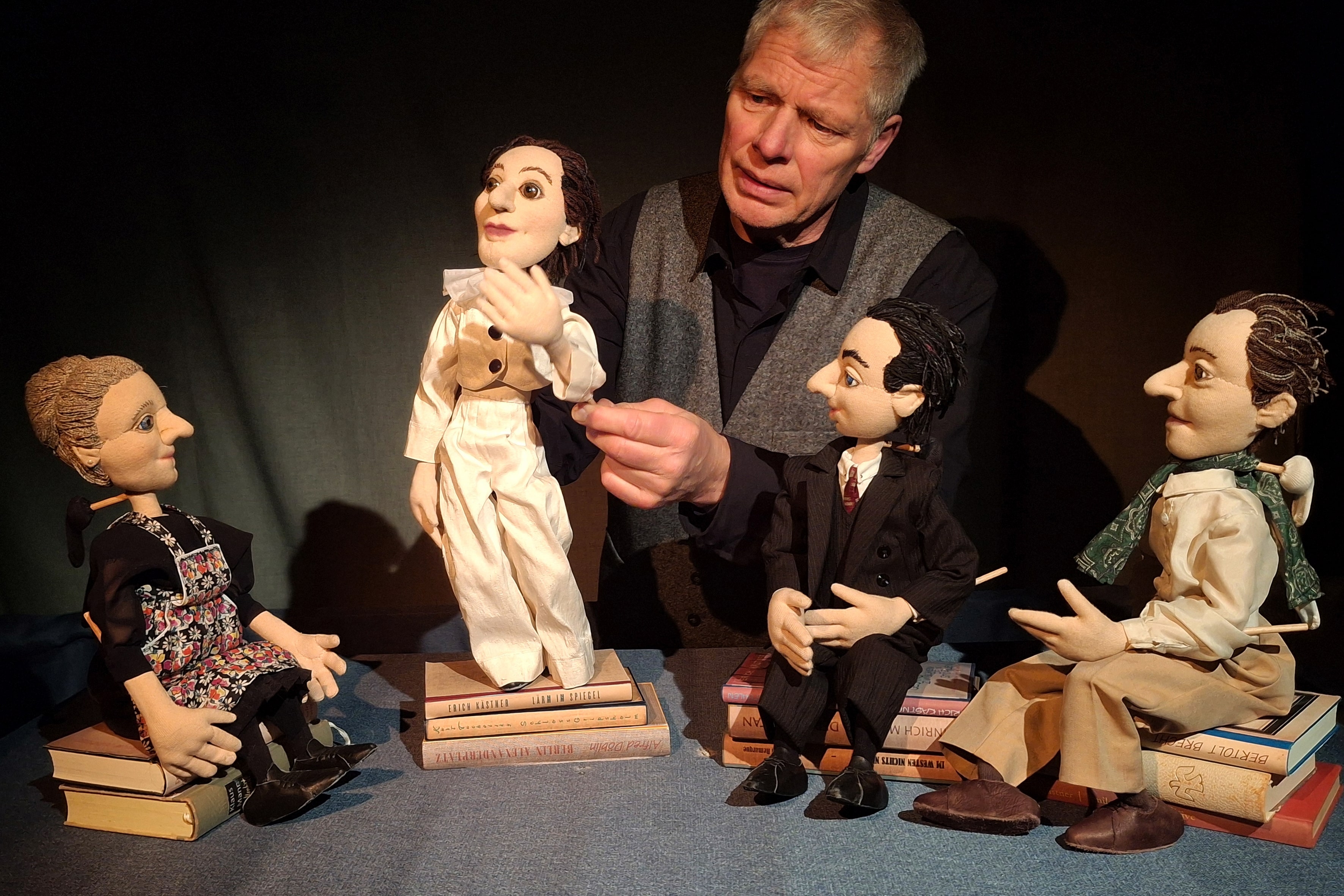 Ein Theaterstück mit Figuren und einem Schauspieler