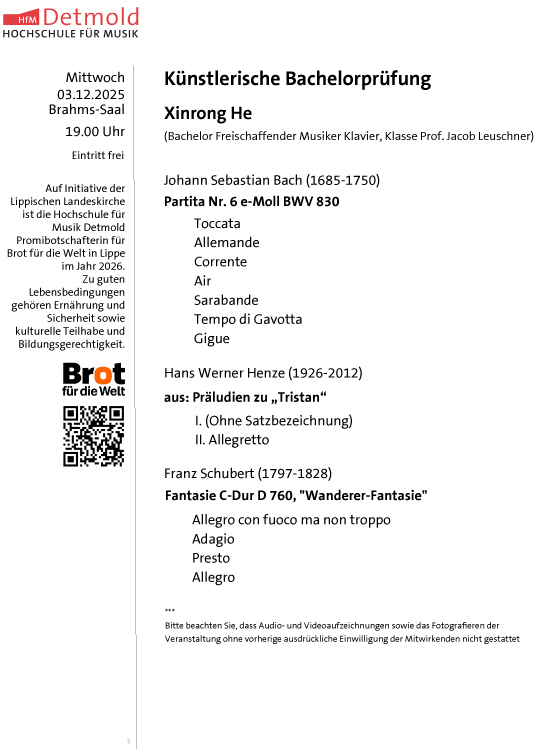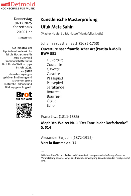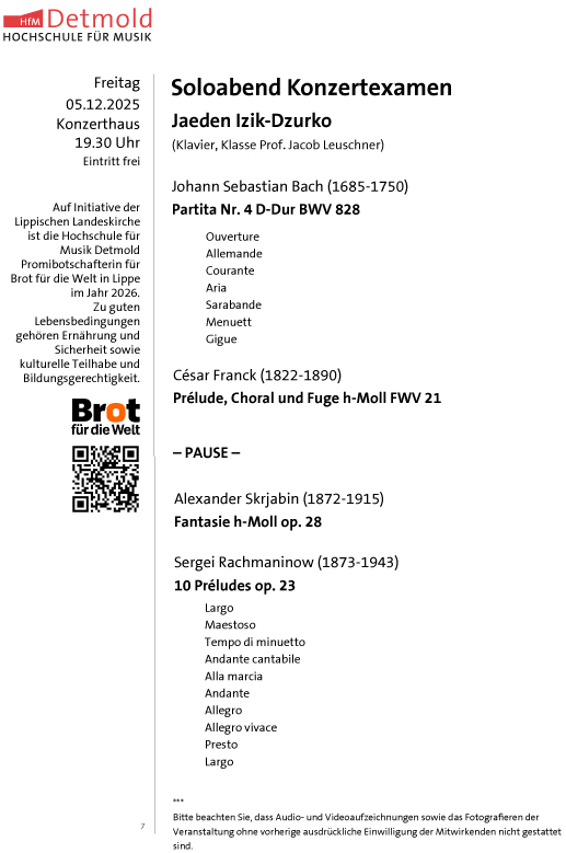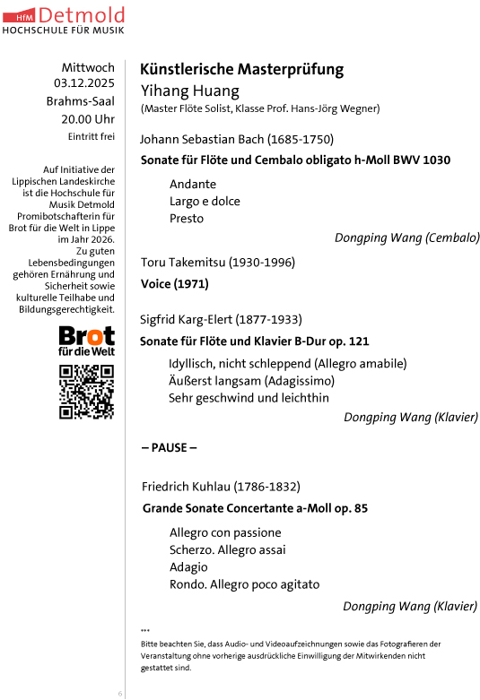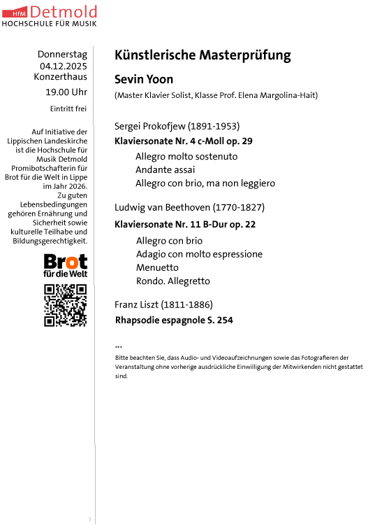 | Künslerische Masterprüfungen der Hochschule für Musik Detmold- Eintritt frei