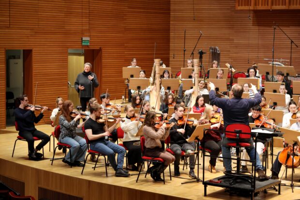 Bildunterschrift: Probensituation mit beiden Hochschulorchestern auf der