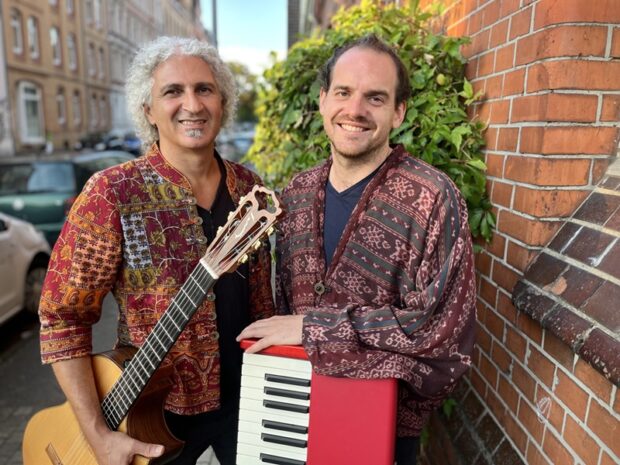 Omid Bahadori, gebürtiger Perser, wechselt spielerisch zwischen mehreren Saiteninstrumenten, archaischer Rahmentrommel, Kalimba und Handpan. Darüber hinaus kann er auf uralte polyphone nomadische Gesangsformen wie den Hömmi (Kehlgesang) und Kargyraa (Untertongesang) zurückgreifen. Pianist und Klangkünstler Arne Dreske ist ein musikalisches Chamäleon, der sich als Kulturbotschafter zwischen den Welten versteht. Sein musikalisches Schaffen steht immer unter dem Credo: Zuhören, improvisieren, inspirieren. Dabei navigiert er mühelos zwischen Elementen aus arabischer Folklore, Jazz, Fusion und traditionellen Musikstilen aus aller Welt.