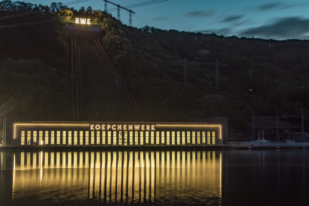 Koepchenwerk Herdecke: Das ehemalige Pumpspeicherkraftwerk Koepchenwerk über dem Hengsteysee in Herdecke leuchtet nachts wieder. Mit Hilfe einer Förderung der NRW-Stiftung wurde die Beleuchtung des Schriftzugs „KOEPCHENWERK“ erneuert. Foto: Markus Bollen/Stiftung Industriedenkmalpflege und Geschichtskultur