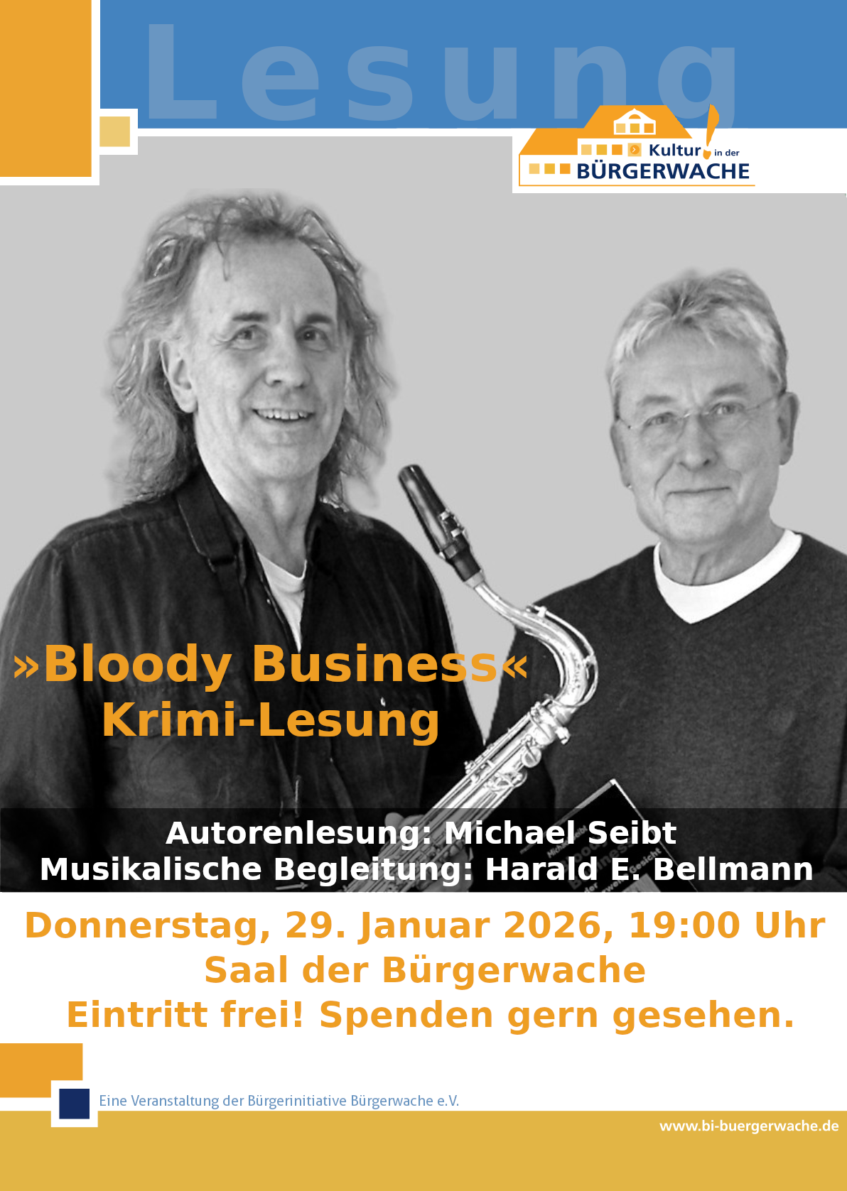 Krimizeit in der Bürgerwache: Am Donnerstag, den 29. Januar 2026, lädt die Kulturwache alle Krimifans zu einem spannenden Abend in die Bürgerwache am Siegfriedplatz ein. Der Bielefelder Krimi-Autor Michael Seibt liest aus seinem aktuellen Werk »Bloody Business oder das zweite Gesicht« und entführt die Zuhörerinnen und Zuhörer in die Welt des Kommissars Frank Seidel.