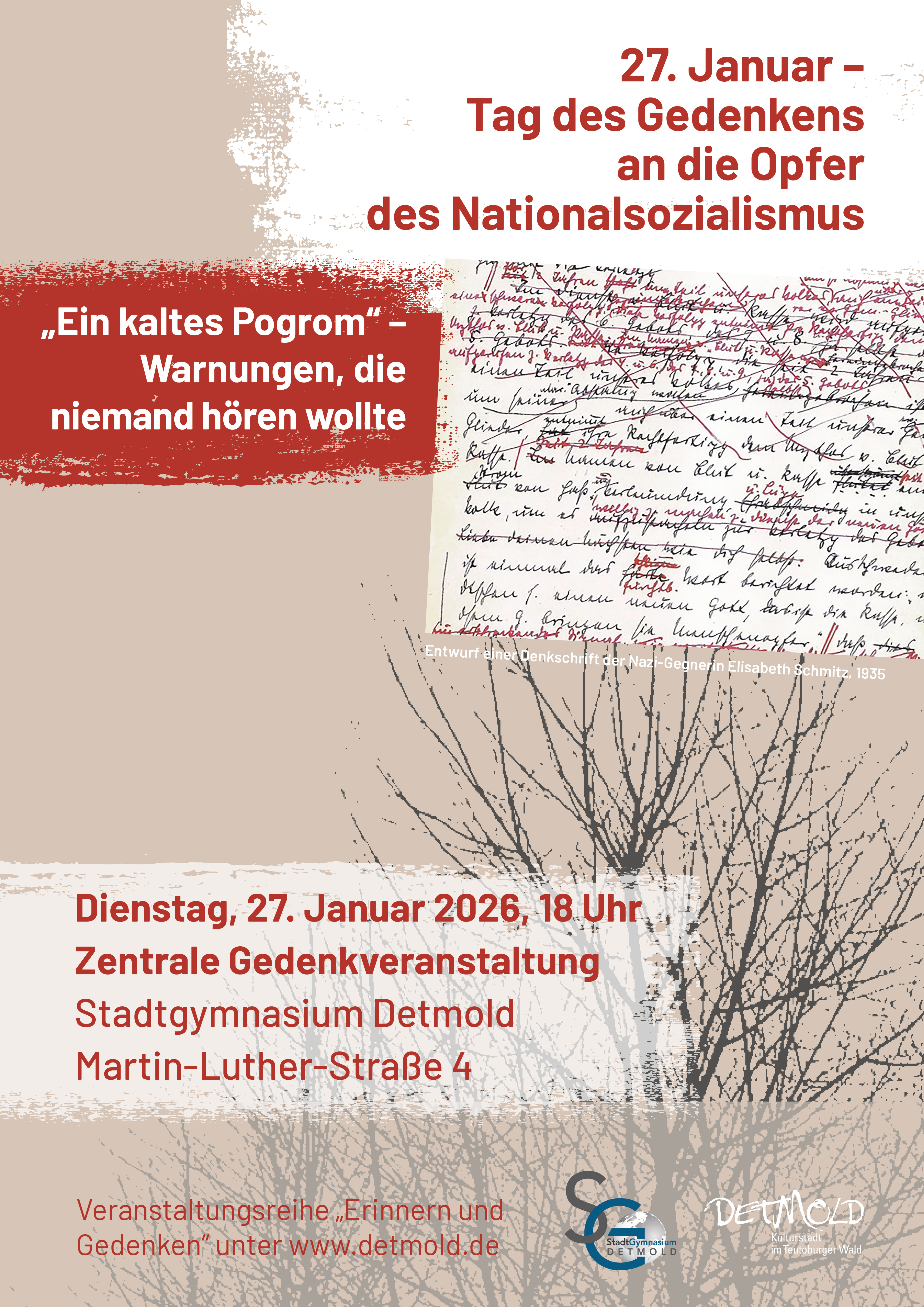 Detmold. Der 27. Januar ist der Tag des Gedenkens an die Opfer des Nationalsozialismus. Überall in Deutschland erinnern Menschen am Jahrestag der Befreiung von Auschwitz an die Opfer der NS-Diktatur sowie an jene, die Widerstand leisteten und NS-Verfolgte schützten. Jedes Jahr richtet eine andere Schule die zentrale Gedenkveranstaltung der Stadt Detmold aus. In diesem Jahr lädt das Stadtgymnasium am Dienstag, 27. Januar, um 18 Uhr in seine Aula, Martin-Luther-Straße 4, ein. Das von den Schülerinnen und Schülern erarbeitete Programm steht unter dem Titel „Ein kaltes Pogrom“ – Warnungen, die niemand hören wollte.