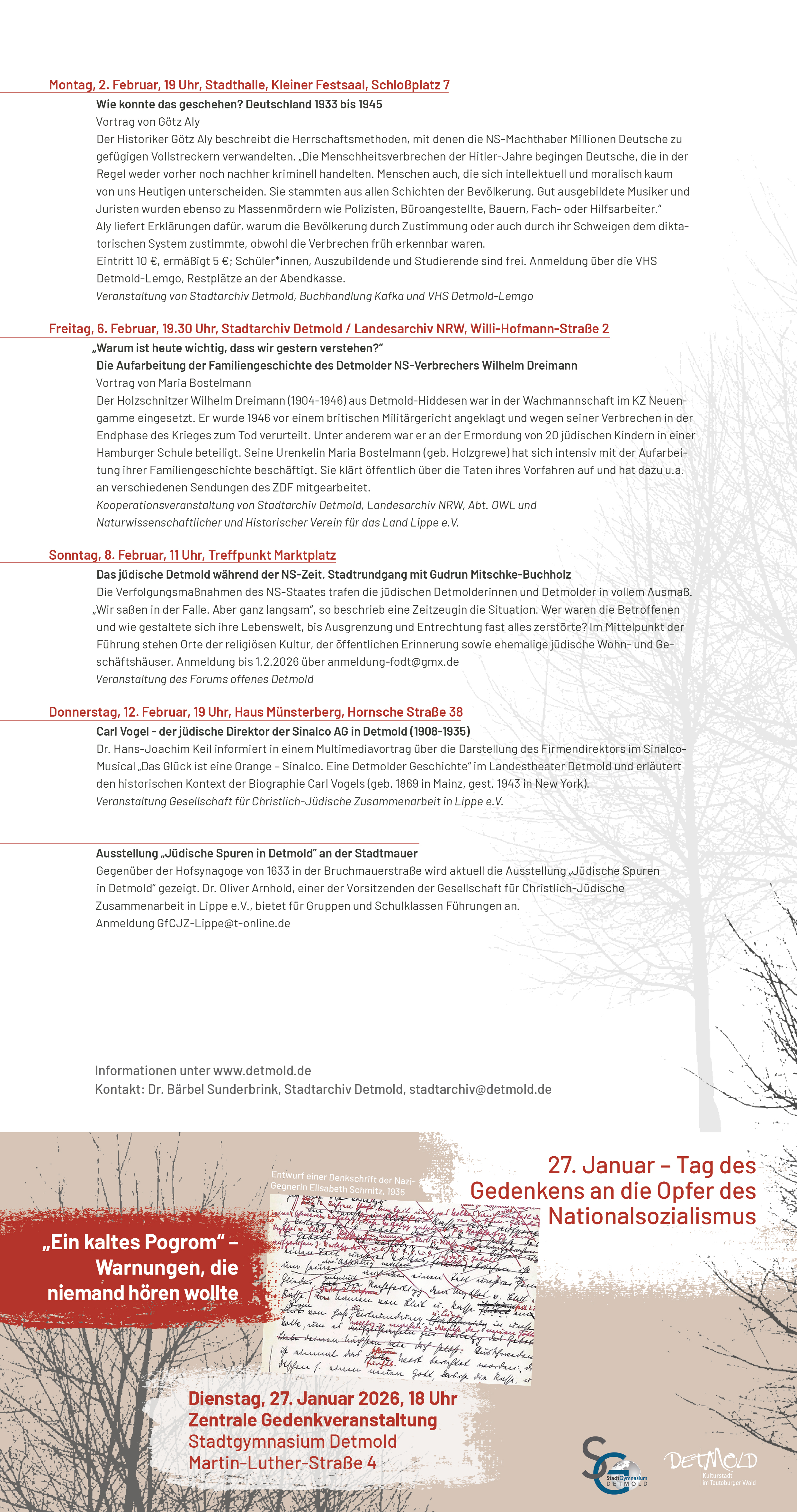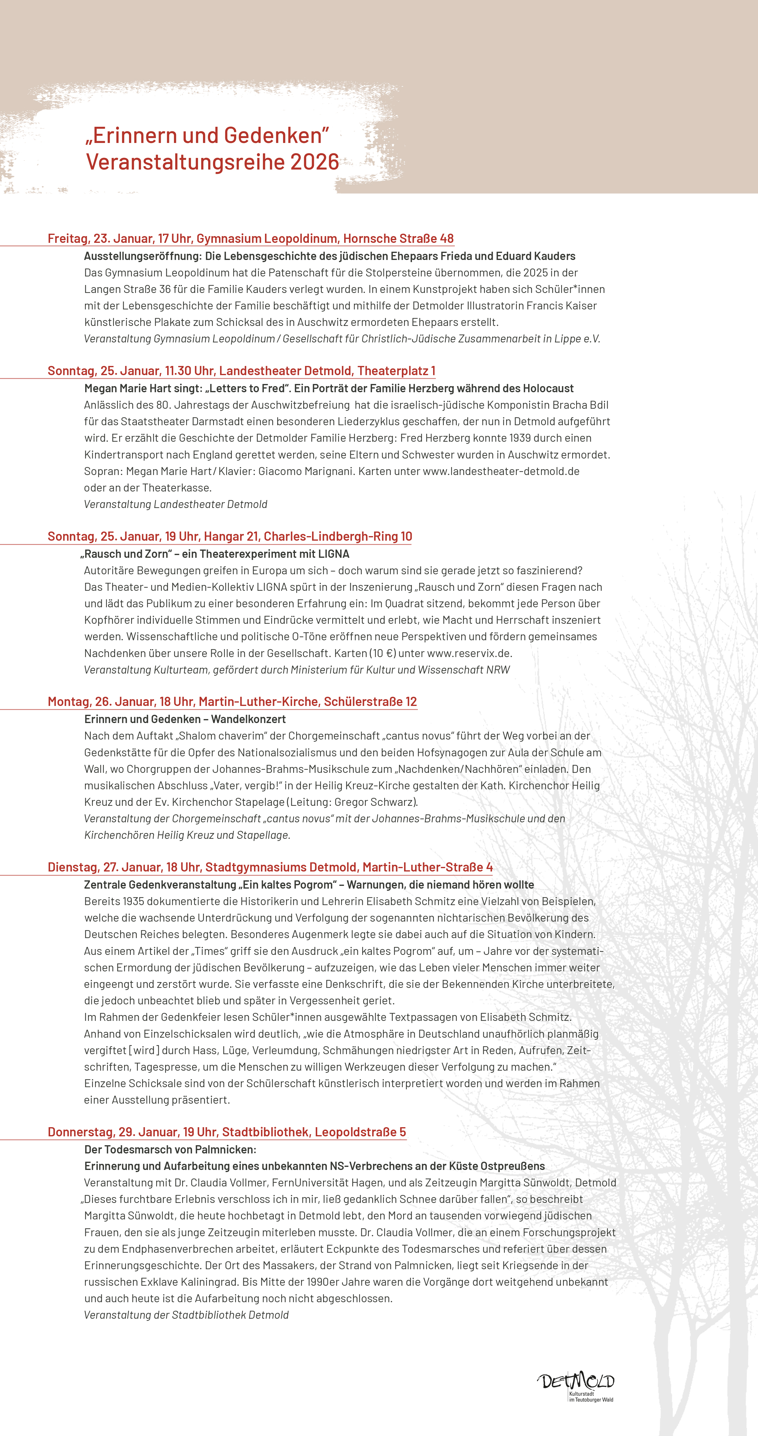 Eine ganze Reihe weiterer Veranstaltungen thematisiert in den Tagen um den 27. Januar die Verbrechen der Nationalsozialisten und erinnert an die Opfer. Viele Akteure wie die Gesellschaft für Christlich-Jüdische Zusammenarbeit, das Landestheater, das Forum offenes Detmold, die Chorgemeinschaft „cantus novus“ und die Johannes-Brahms-Musikschule, die Kirchenchöre Heilig Kreuz und Stapelage, das Landesarchiv NRW, der Naturwissenschaftliche und Historische Verein für das Land Lippe e.V., das Detmolder Stadtarchiv, die Buchhandlung Kafka & Co., die Volkshochschule, die Stadtbibliothek, das Kulturteam der Stadt Detmold und das Gymnasium Leopoldinum haben ein Rahmenprogramm mit Konzerten, Theaterstücken, Vorträgen, Lesungen und einer Ausstellung erarbeitet, um dem Publikum einen vielseitigen Zugang zum Thema zu ermöglichen.