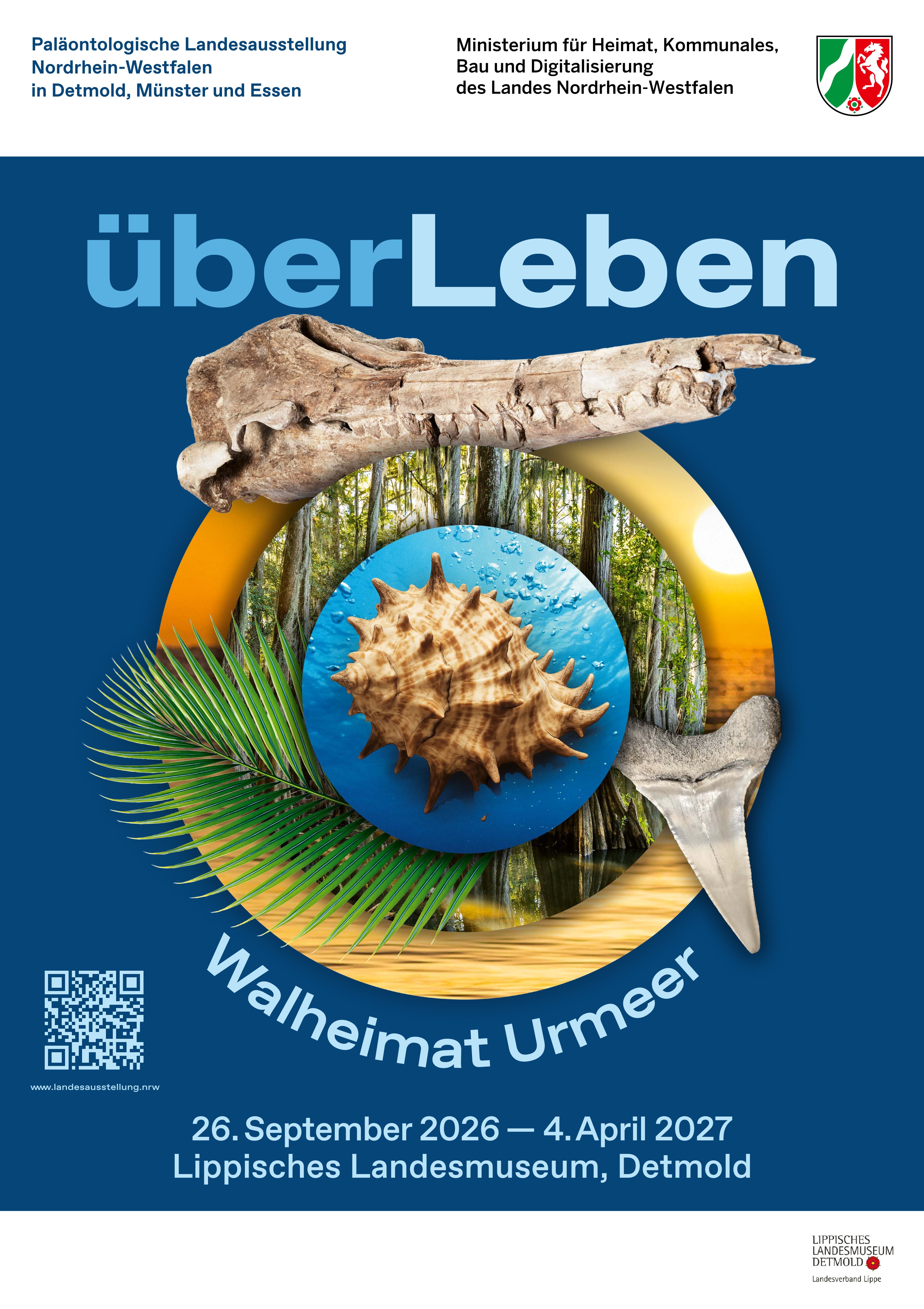 Fossilien bewahren Augenblicke aus einer fernen Vergangenheit und eröffnen bis heute neue Fragen. Genau diese prähistorischen Schätze und spektakulären Fossilfunde rückt Nordrhein-Westfalen 2026 mit einer Paläontologischen Landesausstellung unter dem Titel „überLeben“ ins Zentrum, die auf Initiative des Ministeriums für Heimat, Kommunales, Bau und Digitalisierung ins Leben geru- fen wurde. Dabei präsentieren das Ruhr Museum in Essen, das LWL-Museum für Naturkunde in Münster sowie das Lippische Lan- desmuseum Detmold von April 2026 bis September 2027 in drei Ausstellungskapiteln, wie sich das Leben in Nordrhein-Westfalen über Millionen Jahre verändert hat. Die Landesausstellung 2026 wird seitens des Ministeriums für Heimat, Kommunales, Bau und Digitalisierung des Landes Nordrhein-Westfalen mit 1,5 Millionen Euro finanziert. Einen Überblick zur Paläontologischen Landesausstellung liefert die Seite www.landesausstellung.nrw