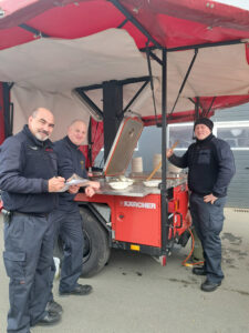 Foto2: Für Begeisterung sorgten (von links) Ronny Bauer, Sascha Herde und Linas Altevogt von der Freiwilligen Feuerwehr Lemgo mit der Erbsensuppe.