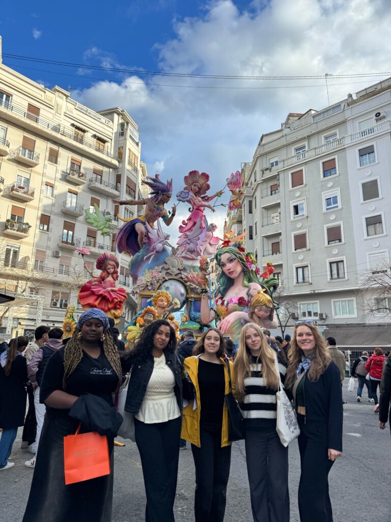 Bildunterzeile: Vertreten Detmold in Europa: Victoria Irhabor, Laujaani Sothilingam, Marta Llopis (Teilnehmerin aus Spanien), Ina Agethen und Sophie Gurcke vor den prächtigen Fallas-Figuren in Valencia – ein Moment voller Begegnung und Kultur. Foto: Sophie Gurcke