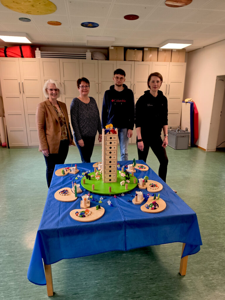 Foto: (von links) Claudia Holle, Geschäftsführerin der Osthushenrich-Stiftung, Nicole Menz, Leiterin des Kindergartens Voßheide, Niklas Berge, Erzieher, und Nina Marhofen vom RS-Workshopteam vor dem Tisch, an dem der Königinnen-Geburtstag geplant