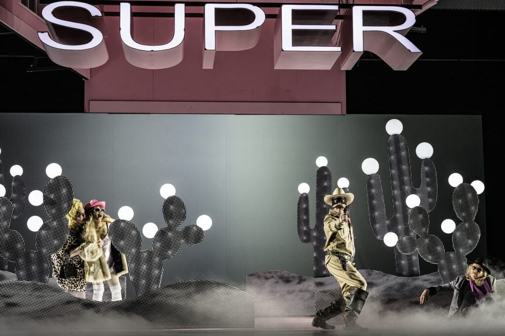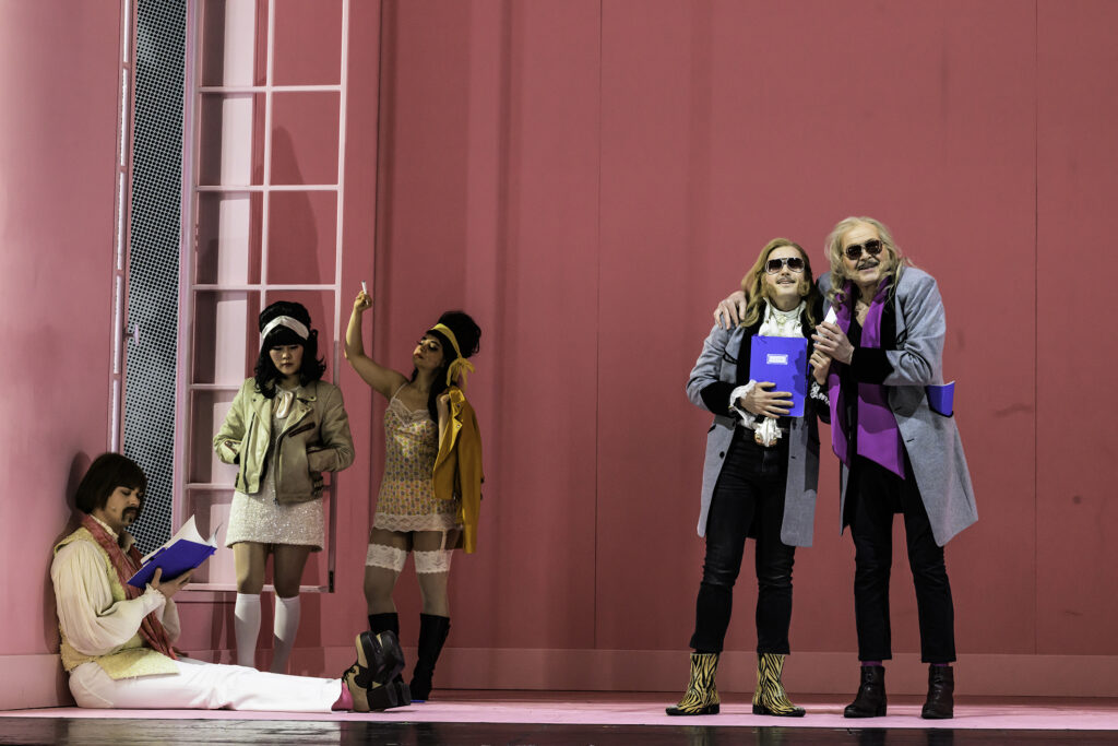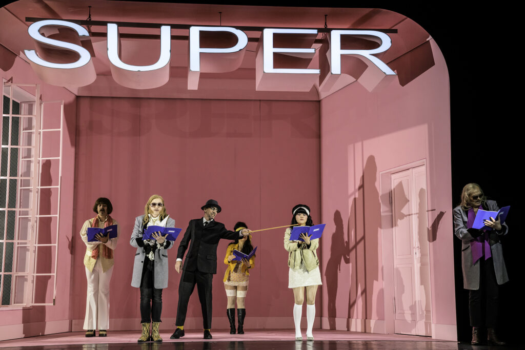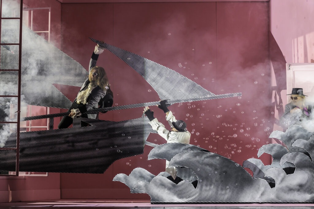 rosafarbenen Bühnenraum mit seiner betont mechanisch-eindimensionalen Kulisse entfaltet sich die Handlung mit ihren zahlreichen Spielorten fast selbst wie eine Inszenierung. Die Choreografie greift Walzer, Tango, Polka und zahlreiche weitere Tanzformen auf, die einerseits die Freude des Werks ausmachen und andererseits das Lachen hervorrufen, das dem einen oder der anderen im Halse stecken bleiben dürfte. Die naive Titelrolle wird komisch wie mitreißend von Andrei Skliarenko verkörpert, der vor allem in seiner Sehnsucht nach Cunegonde, Veronika Lee, herzzerreißende Leitmotive erklingen lässt. Auf seine Zeit als junger Naivling blickt Schauspieler Thomas Wolff als Voltaire und Alter Candide zurück und führt mit seinen Texten durch Szene und Handlung des Stücks. Maximilian und Paquette – Tomas Kildišius, auch als Captain zu erleben, und Mayan Goldenfeld – wuchsen einst gemeinsam mit Candide und Cunegonde auf Schloss Thunder-Ten-Tronckh auf, bevor auch sie jäh in die Welt der Katastrophen geworfen werden. Evgueniy Alexiev ist als Pangloss der optimistische Indoktrinierer der jungen Generation, kann aber als dessen pessimistischer Antipode Martin und als Cacambo unter Beweis stellen, dass nicht nur Katzen mehrere Leben haben. Alexandra Ionis schlüpft als Old Lady in eine zwar nicht allzu in die Jahre gekommene, aber erfahrenere Dame von Welt, die sich mit wechselnden Identitäten vor den