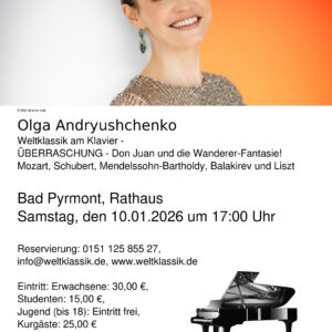 „Weltklassik am Klavier – ÜBERRASCHUNG – Don Juan und die Wanderer-Fantasie!“ Samstag, 10.01.2026 um 17:00 Uhr, Rathaus in Bad Pyrmont. Bis 18 Jahre Eintritt frei, Erwachsene 30,00 €., ...