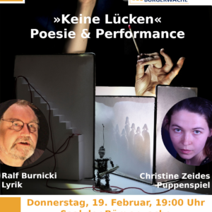 „Keine Lücken“ – Poesie & Performance mit Christine Zeides und Ralf Burnicki Donnerstag, 19. Februar 2026, 19:00 Uhr Ort: Bürgerwache, Saal (Raum 007, EG) Poesie als Gesellschaftskritik – ...